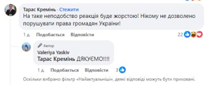 "На таке неподобство реакція буде жорстою! Нікому не дозволено порушувати права громадян України", — написав він в коментарях.