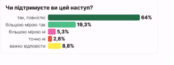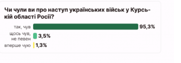 Згідно з даними соціологічного опитування, переважна більшість громадян стежать за подіями в Курській області. Водночас 12,3% опитаних виступають категорично проти дій Сил оборони України на території ворога.