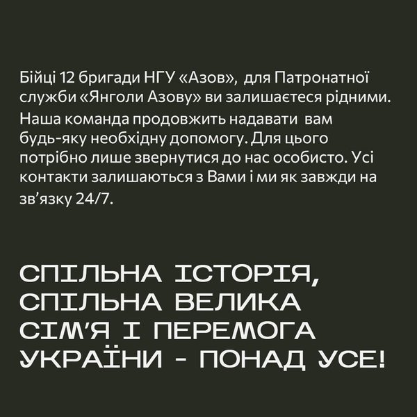 Командир 12 бригади НГУ "Азов" Денис Прокопенко заявив, що пораненими, полеглими, звільненими з полону азовцями та їхніми сімʼями відтепер опікуватиметься нова структура "Азов. Супровід". Патронатна служба "Янголи Азову", що успішно виконує ці завдання з 2014 року, опублікувала офіційну заяву з цього приводу.