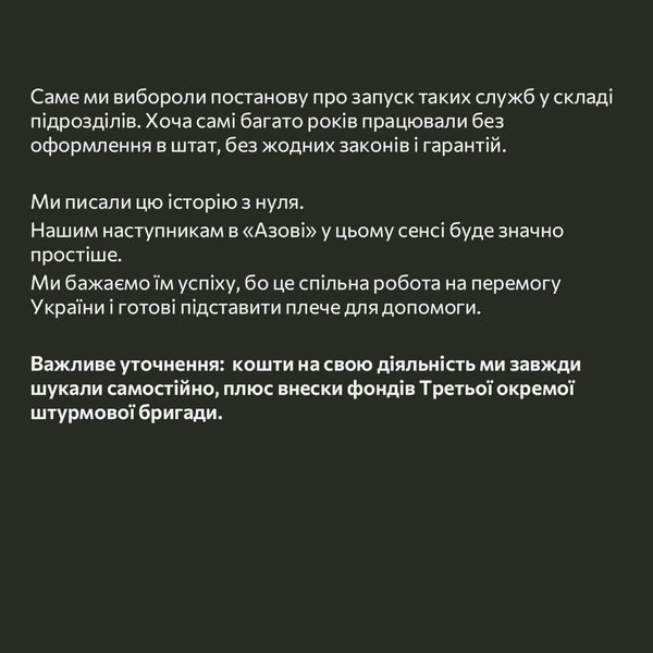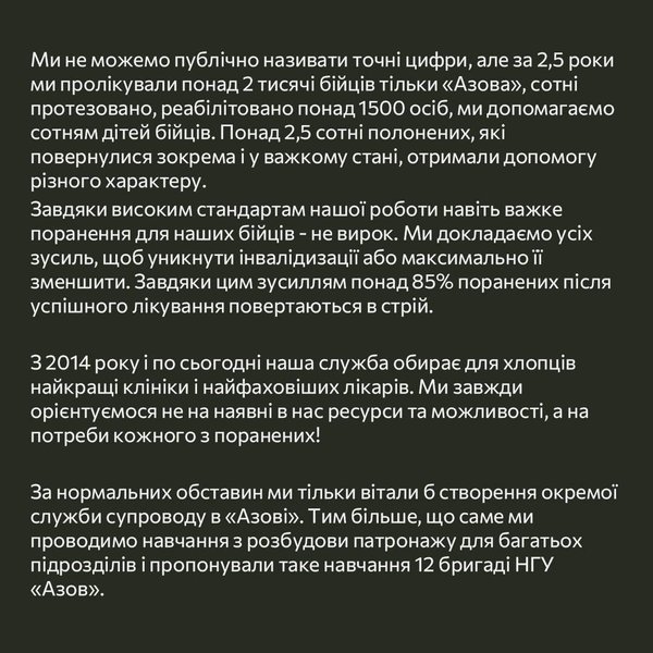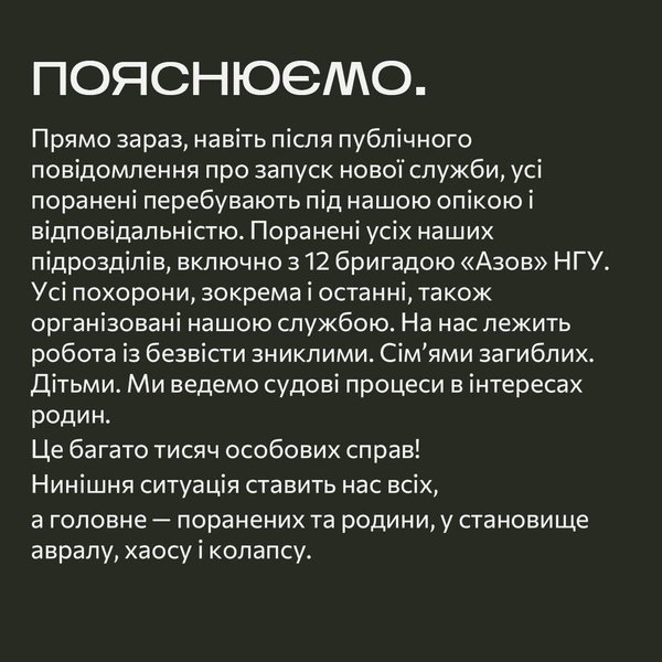"Прямо зараз, навіть після публічного повідомлення про запуск нової служби, усі поранені перебувають під нашою опікою і відповідальністю. Поранені усіх наших підрозділів, включно з 12 бригадою НГУ "Азов". Усі похорони, зокрема і останні, також організовані нашою службою. На нас лежить робота з безвісти зниклими. Сімʼями загиблих. Дітьми. Ми ведемо судові процеси в інтересах родин. Це багато тисяч особових справ. Нинішня ситуація ставить нас всіх, а головне – поранених та родини у становище авралу, хаосу і колапсу" – йдеться в заяві.