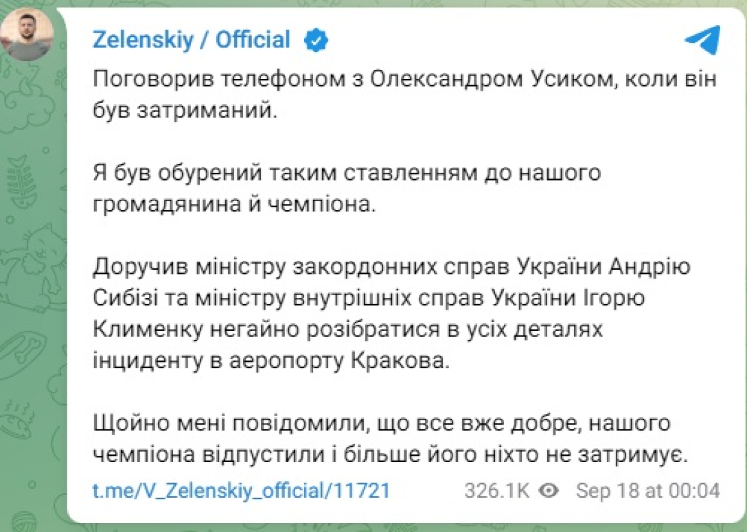 Про те, що Олександра Усика затримали в аеропорту польського Кракова, стало відомо пізно ввечері, 17 вересня. Про інцидент першим повідомив український спортсмен, перший заступник голови комітету Верховної Ради з питань молоді та спорту Жан Беленюк у своєму Telegram. Пізніше виявилося, що інцидент ніяк не пов'язаний із самою персоною Усика. Але невеликий міжнародний скандал встиг статися, оскільки втрутився і президент Володимир Зеленський, і МЗС України. Фокус зібрав усе, що відомо про гучне затримання українського боксера Усика в Польщі.