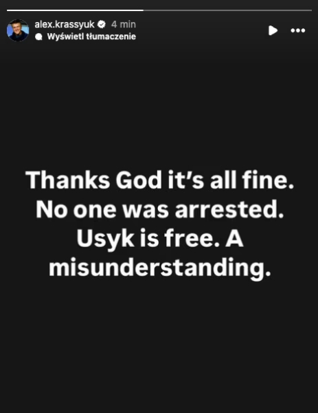 "Слава Богу, зараз усе гаразд. Нікого не заарештовано. Усик на свободі. Сталося непорозуміння", — повідомив Красюк у своїй останній сториз в Instagram.