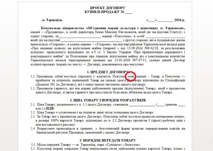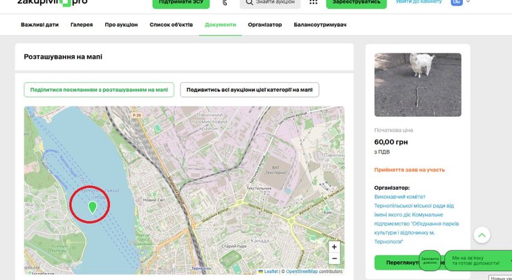 Виконавчий комітет Тернопільської міської ради від імені якого діє КП "Об'єднання парків культури і відпочинку м. Тернополя" виставив на аукціон цапа. Стартова ціна за "лот" 60 гривень. Інформація про продаж тварини з'явилася на сайті zakupivli.pro.