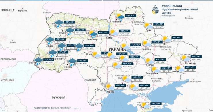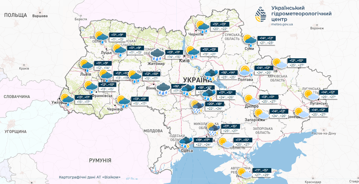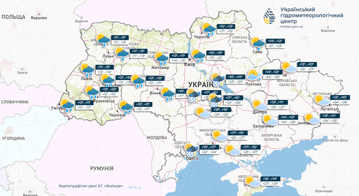 У центральних областях можливі грози. На сході та півдні синоптики обіцяють до +27, на заході температура буде холоднішою — від +11 до +17.