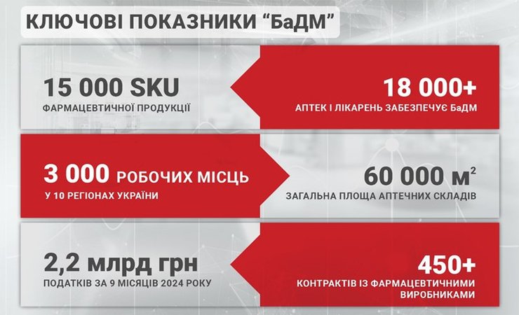 Працювати на захисті здоров’я нації – важлива соціальна задача компанії "БаДМ". Провідний фармацевтичний дистриб’ютор "БаДМ" забезпечує лікарськими засобами понад 18 000 аптек і медичних закладів по всій території України. Компанія системно втілює в життя стратегію розвитку та відкриває нові аптечні склади європейського зразка, попри війну.