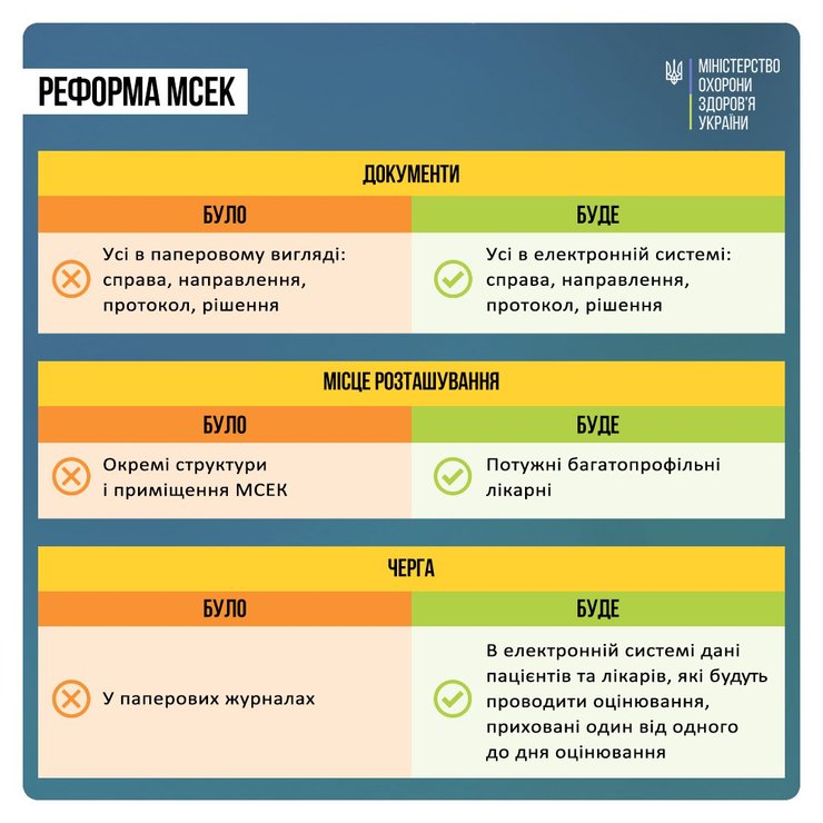 У міністерстві запевняють, що шлях до встановлення статусу інвалідності повинен значно спроститися і скоротитися. Оцінювання проводитимуть команди лікарів-практиків на базі 300 лікарень, які будуть територіально рівномірно розташовані, причому в одному закладі існуватиме декілька команд на кожен профіль справ. За можливості, справи спрямовувати у заклади профільного спрямування.
