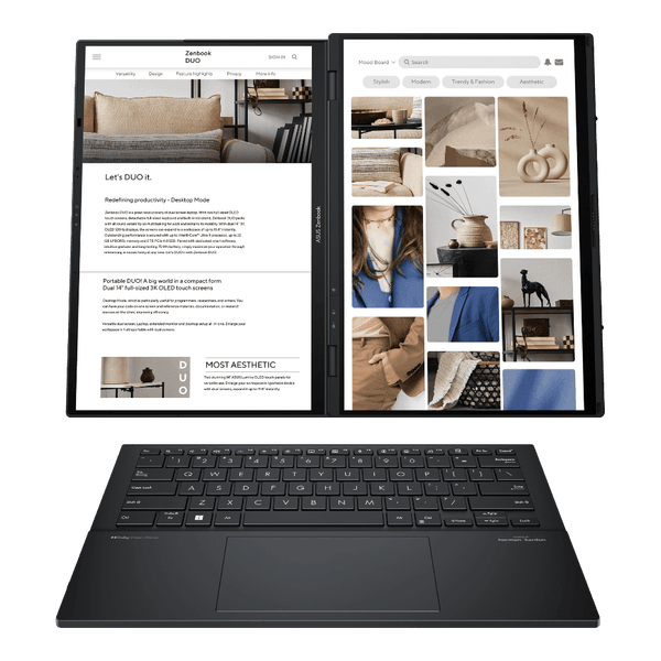 Виробники надихалися футуристичними пейзажами динамічного міста, яке постійно у русі. Тож радять використовувати два екрани як один великий 19,8-дюймовий дисплей для зручного перегляду або ж розділити робочий простір на два, щоб "жонглювати" декількома завданнями одночасно. Обидва дисплеї є сенсорними і підтримують активний стилус ASUS Pen з 4096 рівнями натискання, що робить роботу з ними максимально зручною й інтуїтивно зрозумілою.