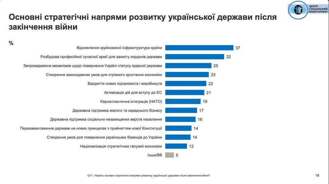 У той самий час основним стратегічним напрямком розвитку української держави після закінчення війни опитані назвали відновлення зруйнованої інфраструктури країни – 37%. Розбудову професійної сучасної армії пріоритетом бачать 32%. На фоні останніх новин третє місце посіла ідея запровадження механізмів щодо повернення Україні ядерного статусу – 25%.