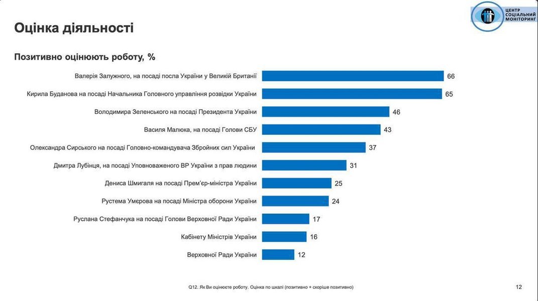 Українці найбільш позитивно оцінюють діяльність Валерія Залужного на посаді посла України у Великій Британії, Кирила Буданова на посаді начальника Головного управління розвідки та Володимира Зеленського на посаді президента. Про це свідчать результати соціологічного дослідження "Оцінка соціально-політичних настроїв населення України", проведеного Центром "Соціальний моніторинг" 15 – 21 листопада 2024 року на замовлення American Political Services, LLC.