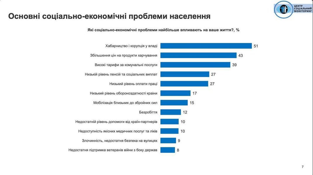 Запитали в українців також, якими вони бачать основні соціально-економічні проблеми. Тут лідером стала відповідь "Хабарництво і корупція у владі" (51%), слідом йдуть "Збільшення цін на продукти харчування" (43%) і "Високі тарифи за комунальні послуги" (39%).