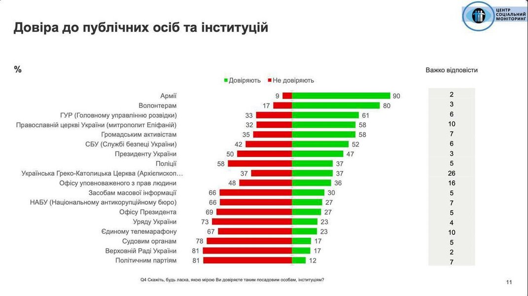 Крім того, українців опитали стосовно довіри до публічних осіб та інституцій. Перше місце очікувано посіла армія із 90% довіри. На другій сходинці опинилися волонтери, яким довіряють 80% респондентів. Головне управління розвідки зайняло третю позицію із 61% довіри українців.