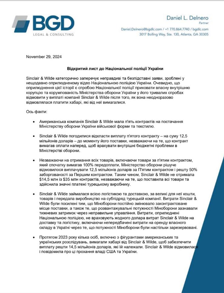 "Sinclair & Wilde категорично заперечує неправдиві та безпідставні заяви, зроблені у нещодавно оприлюдненому відео Національною поліцією України. Очевидно, що оприлюднення цієї історії є спробою Національної поліції приховати власну внутрішню корупцію та корумпованість Міністерства оборони України у його тривалих спробах відмовити у виплаті компанії Sinclair & Wilde після того, як вона неодноразово відмовлялася платити хабарі, які від неї вимагалися", — йдеться у відкритому листі.