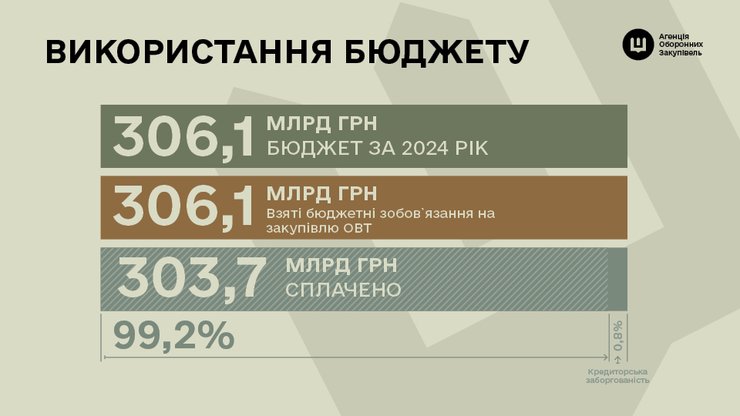 Річний бюджет АОЗ у 2024 році склав 306,1 млрд грн. На 100% від цієї суми було укладено контракти, а 99,2% коштів сплачено постачальникам. Незначний залишок у 0,8% виник через технічні причини, зокрема, постачання товарів у останні дні року.
