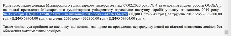 В суді Ківалов представив довідки про зарплату нардепа і з "Міжнародного гуманітарного університету", який він очолює. Якби йому призначили пенсію в розмірі 90% зарплати нардепа, він би отримав всього 39,7 тис. грн. Тому він вимагав врахувати також зарплату з університету. І, очевидно, щоб мати максимально велику пенсію, приватний виш, який очолює Ківалов, різко підняв йому зарплату — до 442,7 тисяч гривень.