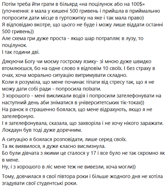 "Потім треба йти грати в більярд "на поцілунок або на 100$" (уточнення: я мала у кишені 500 гривень і прийшла в приймальню попросити дати місце в гуртожитку на яке і так мала право). Я відповідаю вкотре, що цього не буде і можу лише віддати останні 500 гривень)) Але схема гри дуже проста — якщо шар потрапляє в лузу, то поцілунок. І так години дві", — зазначила дівчина.