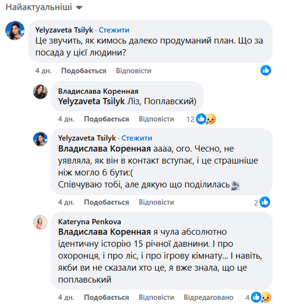 У дописі Коренная не вказувала імені, але у відповідях на коментарі акторки Єлизавети Цілик підтвердила, що йдеться про Михайла Поплавського.
