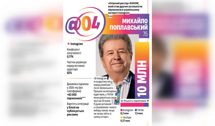 У свіжому журналі Forbes опубліковано Топ 20 інфлюенсерів України, 4 місце cеред найвпливовіших блогерів України посів Михайло Поплавський з сукупною аудиторією у ТikТok, Instagram таYouTube — 10 млн. підписників.
