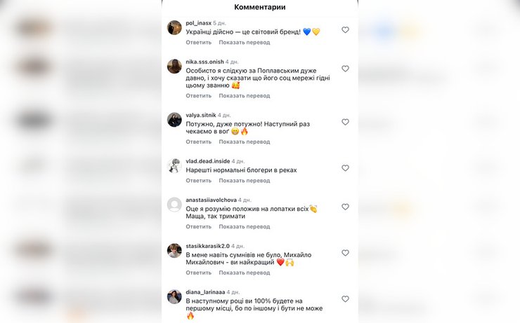 Михайло Поплавський поділився новиною зі своїми підписниками подякувавши їм, що розділяють його бачення популяризації українськості та звернувся до молоді із закликом "З гордістю представляти Україну в соціальних мережах".