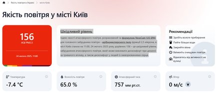 "Індекс якості атмосферного повітря для головного забрудника повітря – дрібнодисперсного пилу фракції 2,5 мікрона, в місті Київ станом на 11:00, 24 лютого 2025 року дорівнює 156 – це шкідливий рівень забруднення атмосферного повітря, який може викликати дискомфорт при диханні за тривалого впливу, а також дискомфорт у людей із захворюваннями серця", — йдеться в повідомленні.