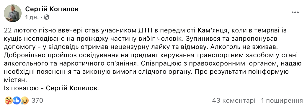 У скоєному ДТП публічно зізнався ректор Кам'янець-Подільського національного університету імені Івана Огієнка Сергій Копилов, опублікувавши 23 лютого на своїй сторінці у Facebook пост з подробицями.