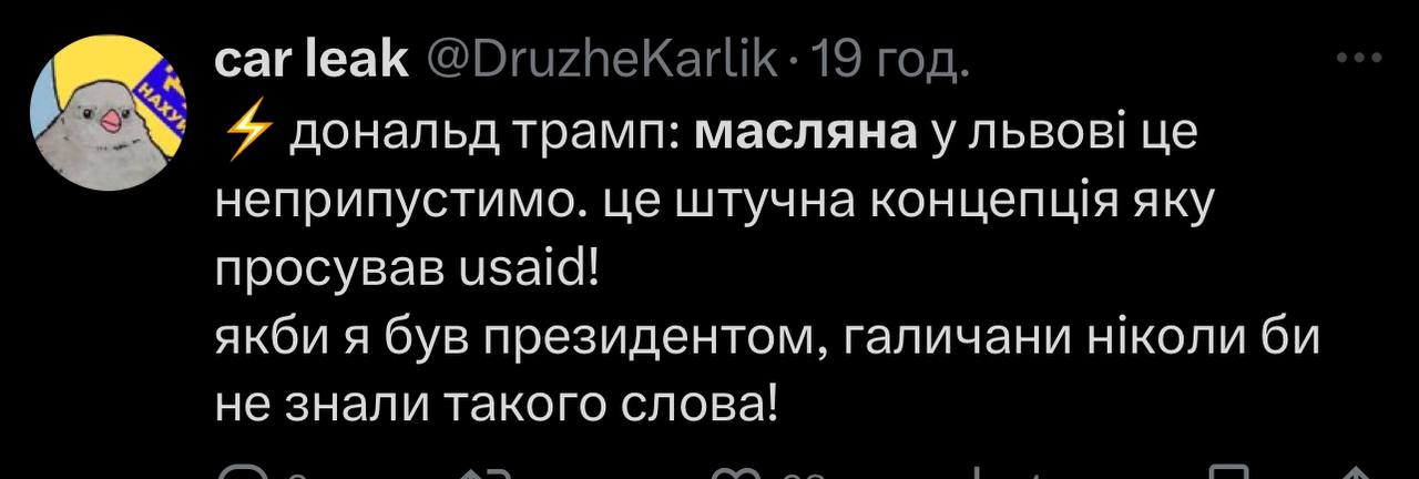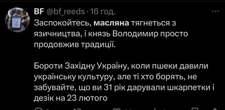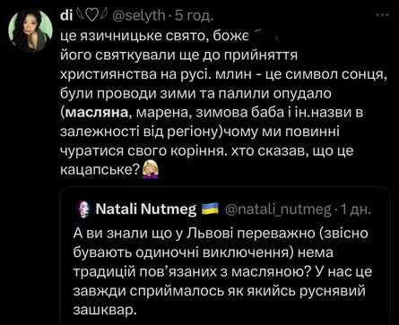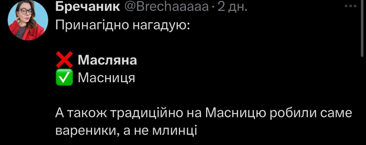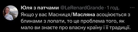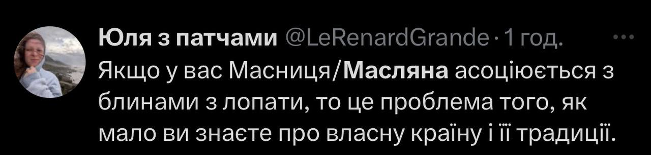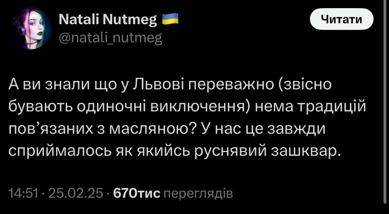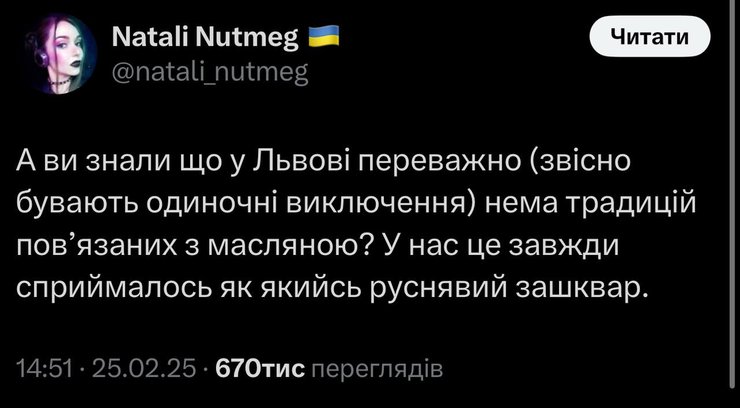 Користувачка мережі написала, що в її оточенні у Львові немає традицій, повʼязаних з Масляною. Вона додала, що в них це свято завжди асоціювалося з російськими традиціями. Втім, багато українців не погодилися, а допис уже зібрав понад 670 тисяч переглядів на фоні палкого обговорення.