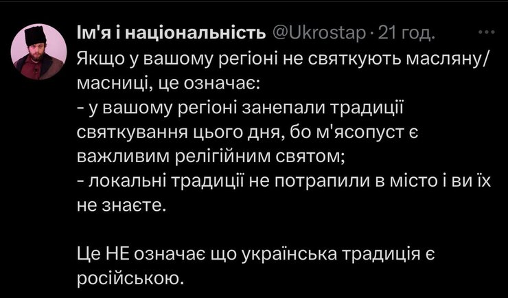 "Якщо у вашому регіоні не святкують масляну/масниці, це означає: у вашому регіоні занепали традиції святкування цього дня, бо м'ясопуст є важливим релігійним святом; локальні традиції не потрапили в місто і ви їх не знаєте. Це НЕ означає що українська традиція є російською", — написав Українець.