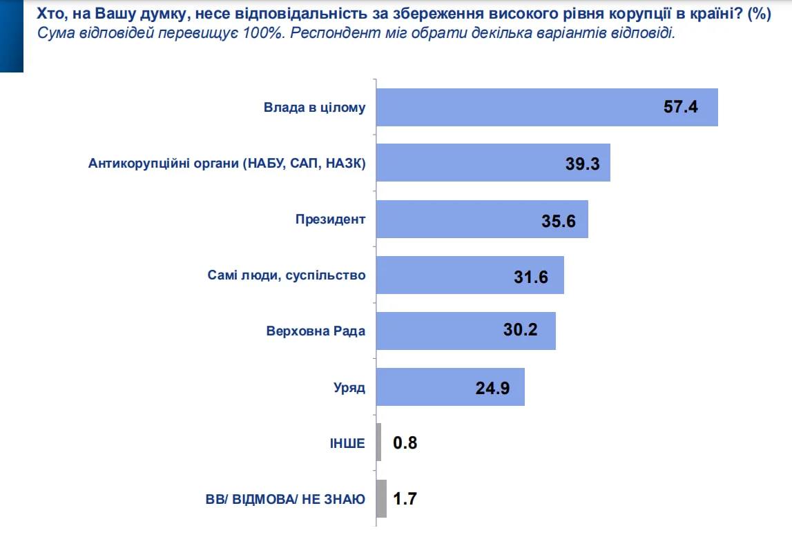 Владу в цілому вважають відповідальною за високий рівень корупції 57,4% респондентів. Антикорупційні органи звинуватили 39,3% українців, президента Україні — 35,6%, самих людей і суспільство — 31,6%. Верховну Раду України вважають винуватою у високому рівні хабарництва 30,2% опитаних, Кабінет міністрів — 24,9%.
