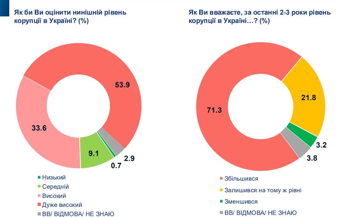 Рівень корупції в Україні як дуже високий оцінили 53,9% респондентів, як високий — 33,6%. Середнім рівень хабарництва назвали 9,1% опитаних, низьким — 0,7%.