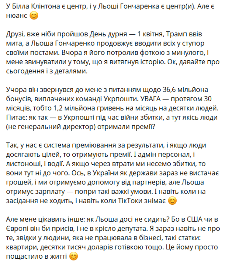 Він розповів, що 2 квітня до керівника підприємства звернувся нардеп із питанням щодо використання 36,6 мільйона бонусів, виплачених команді Укрпошти "протягом 30 місяців. Директор наголосив, що це виходить "1,2 мільйона гривень на місяць на десятки людей".