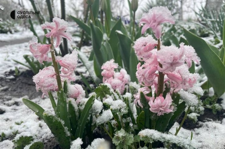 На оприлюднених в мережах кадрах видно засніжені дерева та квіти, які вже встигли розквітнути.