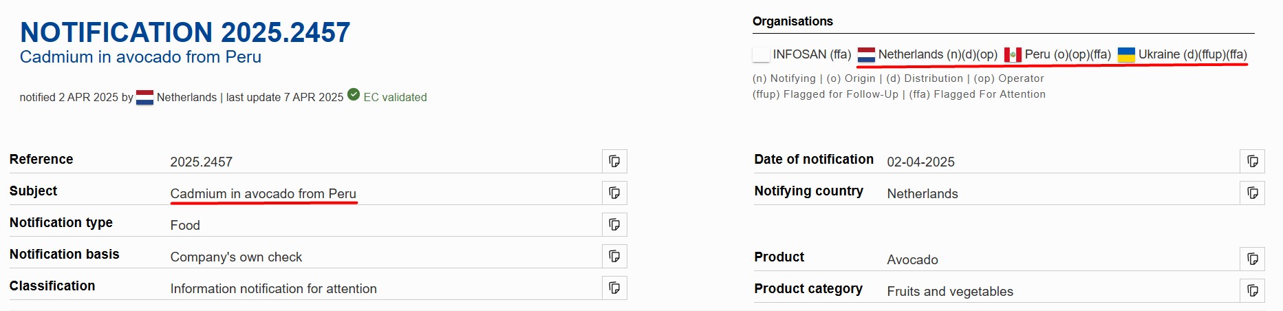 Тим часом на порталі Європейської комісії відшукалось попередження RASFF щодо отруйних авокадо. Попередження опублікували 2 квітня й у ньому ішлося про підвищений вміст кадмію у плодах з Перу. Вказано, що рівень ризику "високий". На сторінці зауважується, що вони доправлені у Нідерланди та мали іти в Україну. 7 квітня з'явилась інформація, що авокадо знищать.