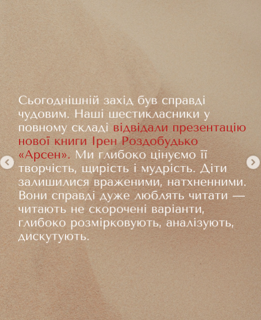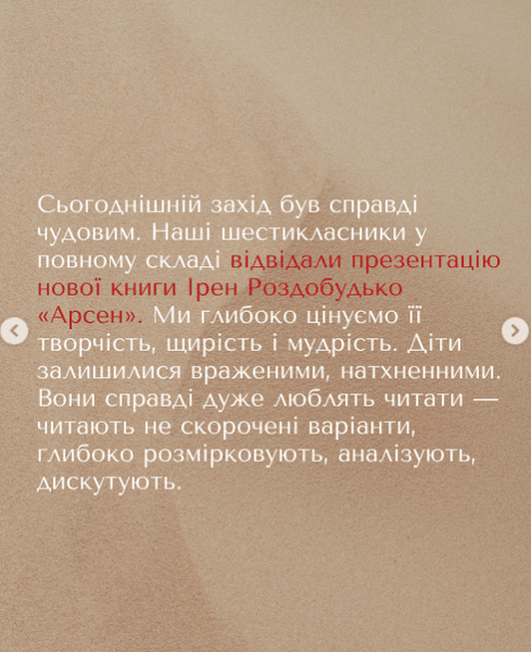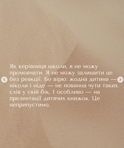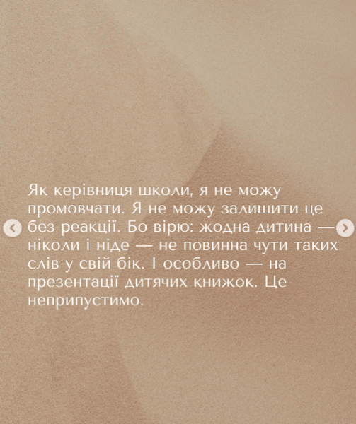 "Як керівниця школи я не можу промовчати. Бо вірю: жодна дитина — ніколи і ніде — не повинна чути таких слів у свій бік. І особливо на презентації дитячих книжок. Це неприпустимо", — написала вона.