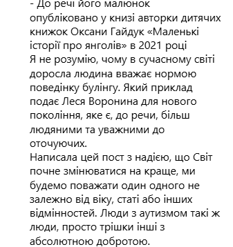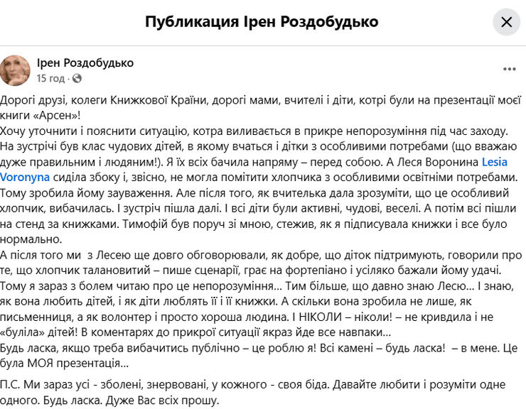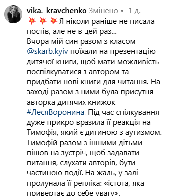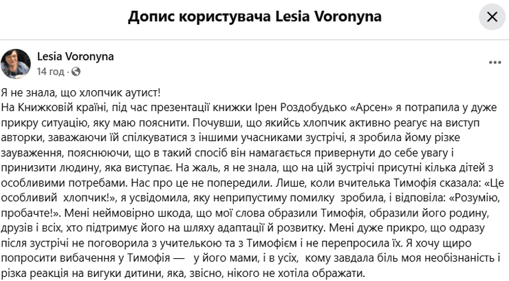 "Під час спілкування дуже прикро вразила її реакція на Тимофія, який є дитиною з аутизмом. Тимофій разом з іншими дітьми пішов на зустріч, щоб задавати питання, слухати авторів, бути частиною події. На жаль, у залі пролунала її репліка: "істота, яка привертає до себе увагу", — написала жінка.