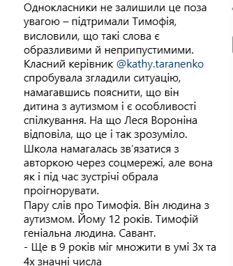 Вона додала, що на ці слова відреагували однокласники. Крім того, класна керівничка пояснила Лесі Ворониній, що хлопець — дитина з аутизмом і має особливості спілкування. На що вона відповіла, що "це і так зрозуміло". З авторкою намагались зв'язатись представники школи, однак "вона, як і під час зустрічі, обрала проігнорувати".