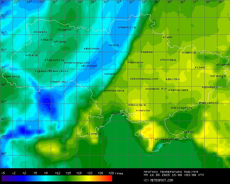 Найхолодніше 16 травня буде вздовж смуги: Чернігівська, Київська і Вінницька області. Там стовпчики термометрів фіксуватимуть лише від 8 до 12 градусів тепла.