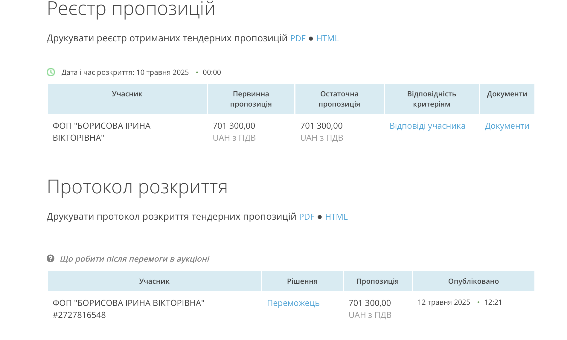 Учасник та переможець один — ФОП "Борисова Ірина Вікторівна".