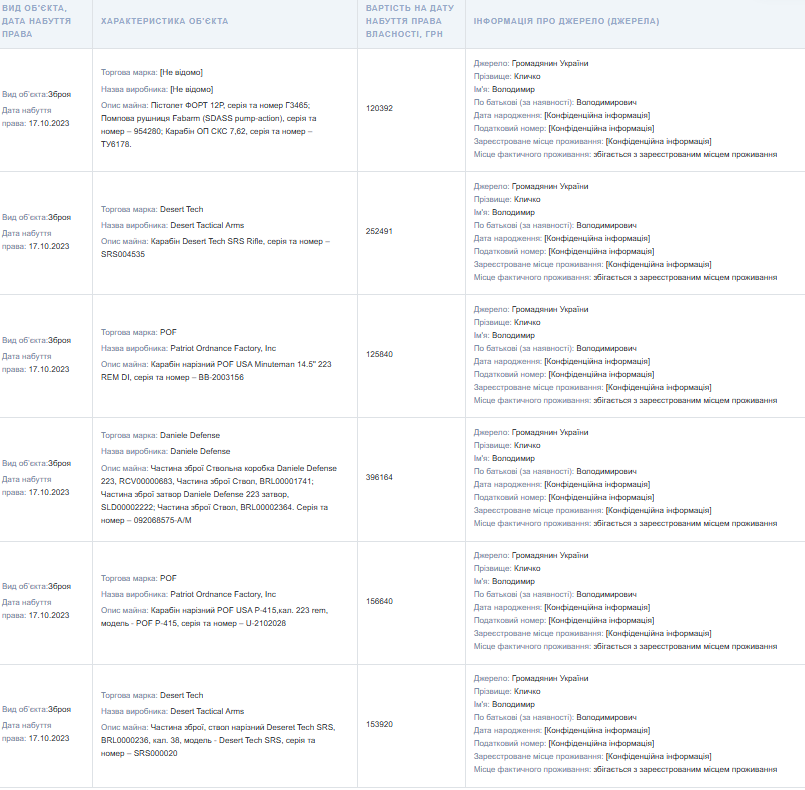 Крім того, окремо Кличко задекларував ще один подарунок від брата — мисливський нарізний карабін TS HTI, калібру .408 СТ, торгової марки "Тактичні системи", вартістю 536,22 тис. грн. Цей подарунок мер отримав 1 серпня 2024 року.