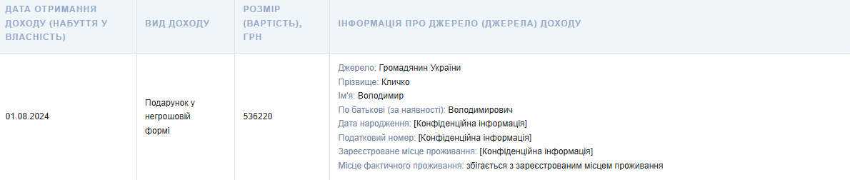 14 травня 2025 року Віталій Кличко подав повідомлення до Національного агентства з питань запобігання корупції (НАЗК) про суттєві зміни в майновому стані. Зокрема, йдеться про отримання подарунків у негрошовій формі загальною вартістю 1,21 млн грн, які були передані йому ще в жовтні 2023 року.