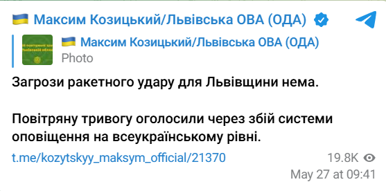 "Загрози ракетного удару для Львівщини нема. Повітряну тривогу оголосили через збій системи оповіщення на всеукраїнському рівні", — написав він.