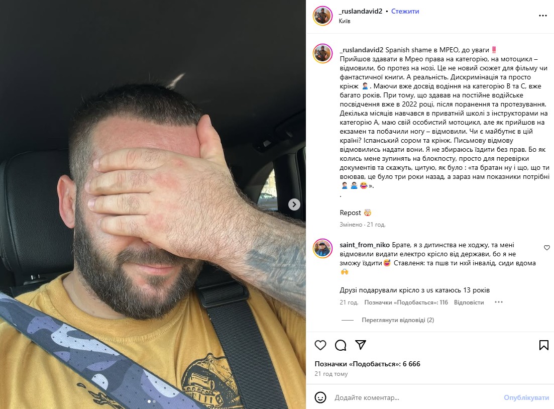 "Прийшов здавати в Мрео права на категорію, на мотоцикл – відмовили, бо протез на нозі. Це не новий сюжет для фільму чи фантастичної книги. А реальність", — написав ветеран.