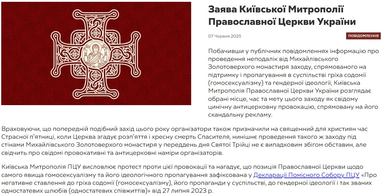 Реакція ПЦУ прайд у Києві з'явилась на порталі релігійної організації.