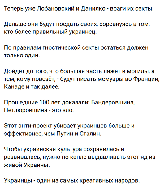 Далі він зазначає, що українці — один із найкреативніших народів у світі, і щоб вони могли реалізуватися на батьківщині, потрібно назавжди заборонити людиноненависницьку ідеологію та змінити анти-проект держави.