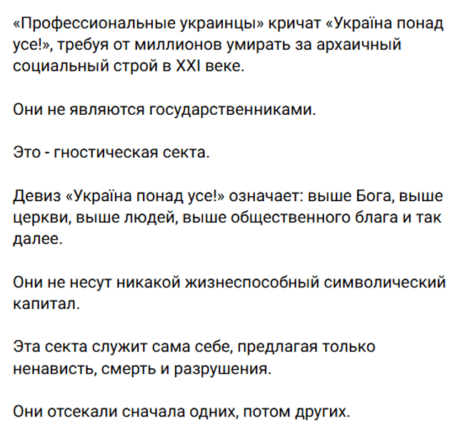 "Вони не є державниками. Це — гностична секта. Вони не несуть жодного життєздатного символічного капіталу. Ця секта служить сама собі, пропонуючи тільки ненависть, смерть і руйнування", — додав він.