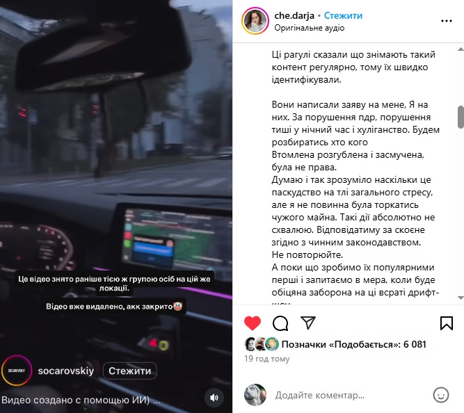 Вона також зауважила, що гонщики регулярно публікували подібне відео в соцмережах. Але нині акаунти закриті, а контент видалений. Проте тільки в Instagram. В TikTok акаунти досі активні.