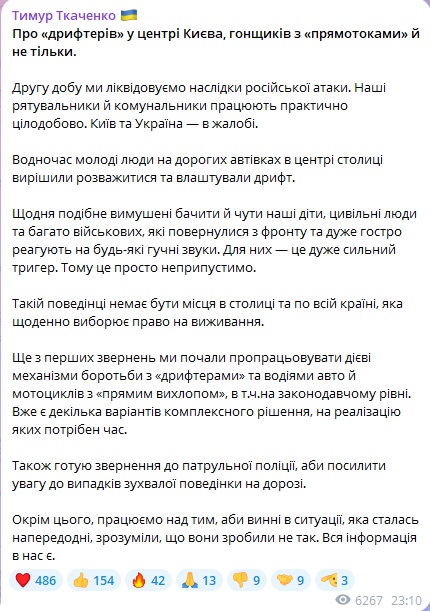Поки що очільник КМВА готує звернення до патрульної поліції, щоб посилити увагу до "дрифтерів". "Окрім того, працюємо над тим, щоб винні в ситуації, яка сталась напередодні, зрозуміли, що вони зробили не так", — пише Ткаченко.