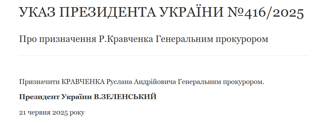 У суботу, 21 червня, президент України Володимир Зеленський підписав указ №416/2025 про призначення генеральним прокурором Руслана Кравченка.
