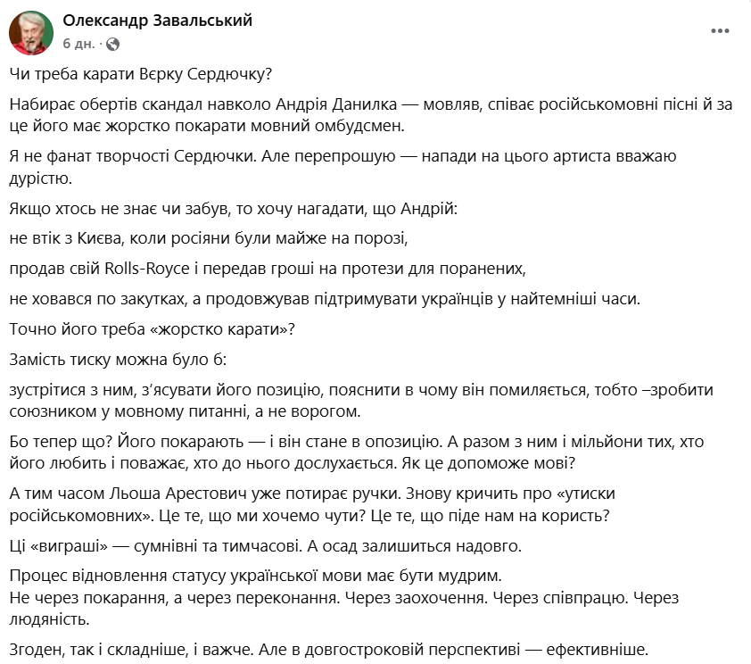 Сам Олександр Завальский вважає "дурістю" скарги мовному омбудсмену на Андрія Данилка, який в образі Вєркі Сердючки співає російськомовні пісні.