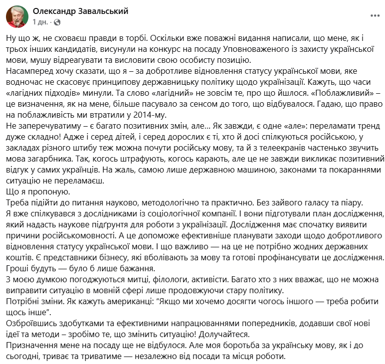 Раніше, 20 червня, Олександр Завальський прокоментував своє ймовірне призначення на посаду мовного омбудсмена, наголосивши, що він виступає за "добротливе" відновлення статусу української мови, яке не скасовує принципової державної політики щодо українізації.