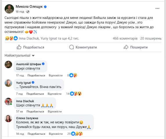 "Сьогодні пішла з життя найдорожча для мене людина! Вийшла заміж за курсанта і стала для мене справжнім бойовим генералом! Дякую, що завжди була поруч!" — написав Микола Олещук.