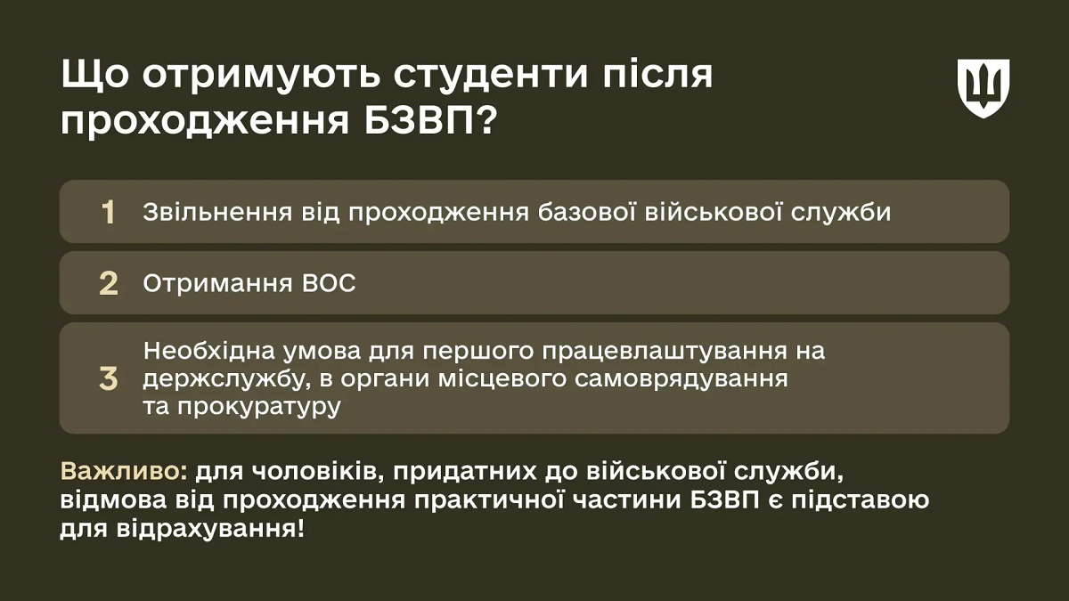 Після проходження БЗВП студенти складають військову присягу та отримають сертифікат і військово-облікову спеціальність. Це звільнить їх від проходження обов'язкової базової військової служби, яку згідно з чинним законодавством мають пройти всі чоловіки віком 18-25 років.